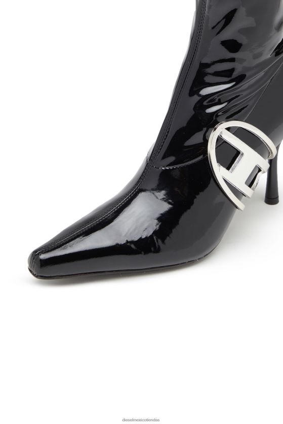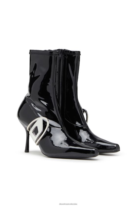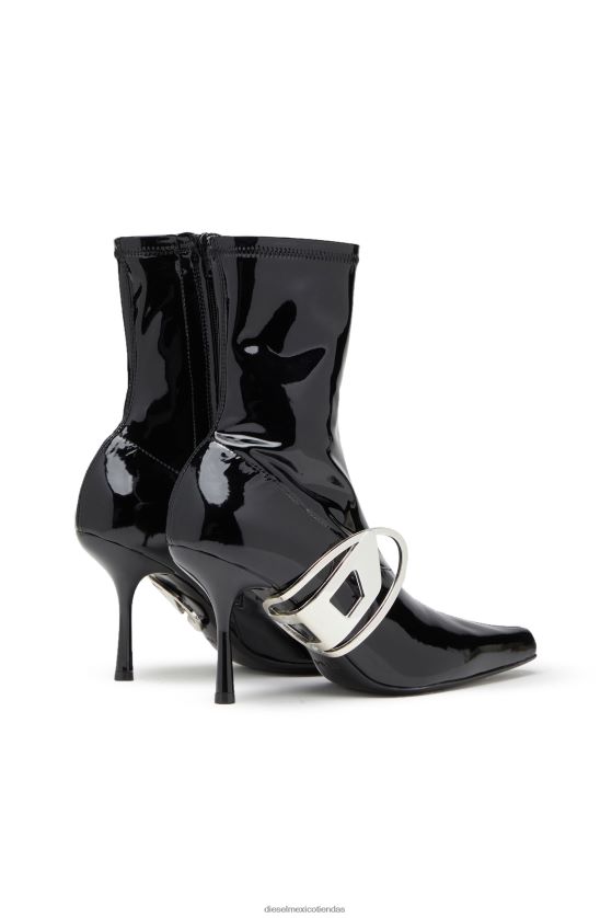 Botines de mujer con tacón de la colección primavera verano 2023. este estilo de calcetín con puntera en punta está confeccionado con un tejido de charol elástico negro, adornado con una placa en forma de D ovalada de metal que envuelve el costado del pie.