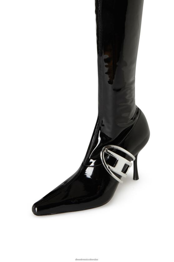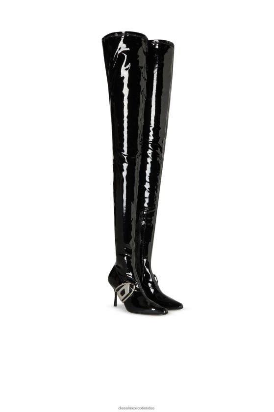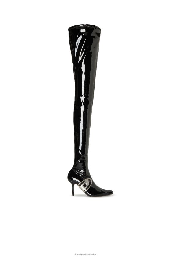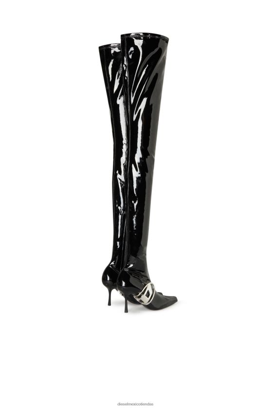 parte de la colección de pasarela primavera verano 2023, estas botas hasta los muslos para mujer están confeccionadas con tela de charol elástica negra. Diseñados con punta en punta y tacón de aguja, están marcados con una gran placa ovalada de metal que envuelve el costado del pie.