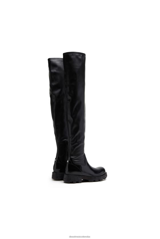 Diseñadas para sentarse sobre las rodillas, estas botas negras para mujer están confeccionadas con cuero brillante con una caña suave y elástica y una suela gruesa con tacos. la parte superior se detalla en la parte posterior con un remache estilo jean de la marca.