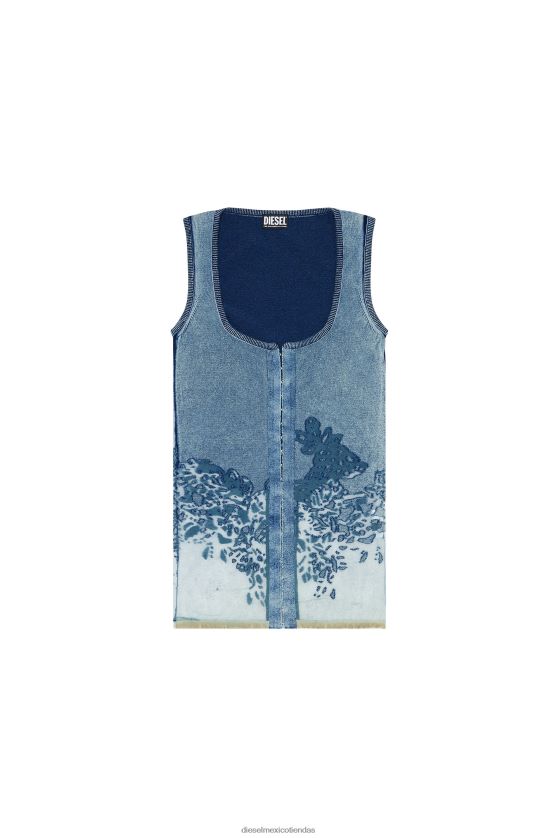 cárdigan de corte regular para mujer de la colección de pasarela primavera verano 2023. esta prenda está confeccionada con punto de algodón índigo lavado a la piedra, tratado con una técnica de desgaste para crear un motivo de encaje degradado que se vuelve más escaso hacia la parte inferior. una placa en forma de d ovalada adorna la nuca.