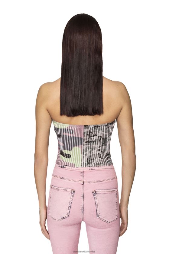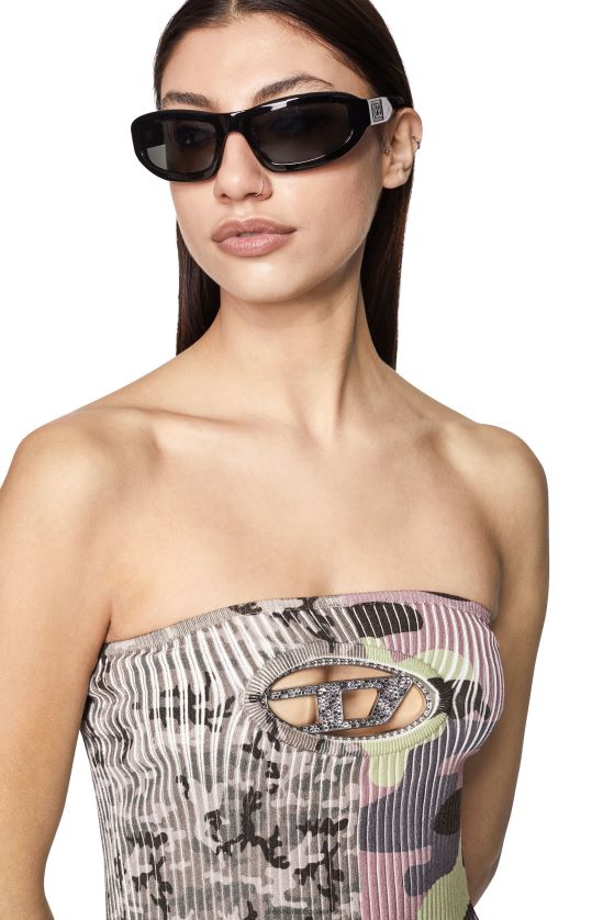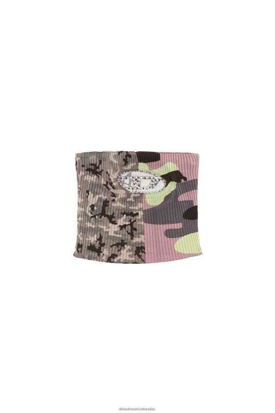 Top bandeau ajustado de mezcla de nailon de la cápsula del desfile de moda, revestido con lycra para una sensación compacta. Con bloques de colores y estampados mixtos de camuflaje, está realzado con una placa de metal con incrustaciones de pedrería en forma de 'd' en el pecho para un efecto de peek-a-boo.