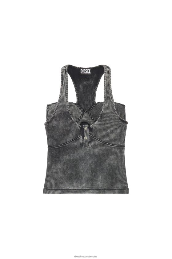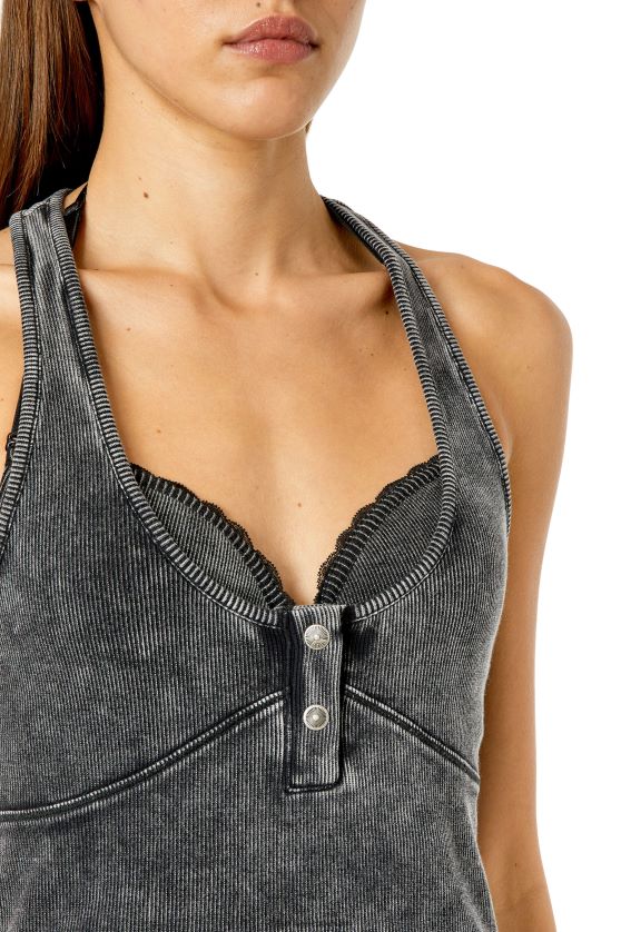 top ajustado con espalda nadadora para mujer con abertura con dos botones, teñido en prenda y lavado para un look desgastado. Equipado con un sujetador de encaje con cuello halter incorporado, este estilo de algodón elástico está adornado con un logotipo "d" ovalado bordado en la parte posterior.