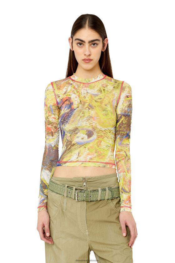 Camiseta de mujer de manga larga con ajuste como una segunda piel, confeccionada en jersey de crepé flexible. salpicado de diminutas aberturas cortadas con láser, este estilo de cuello alto presenta un estampado abstracto completo y costuras decorativas.
