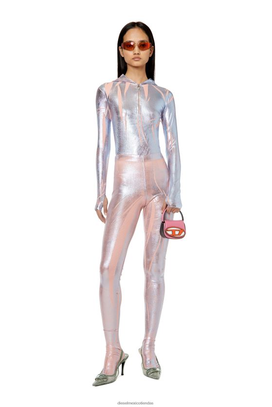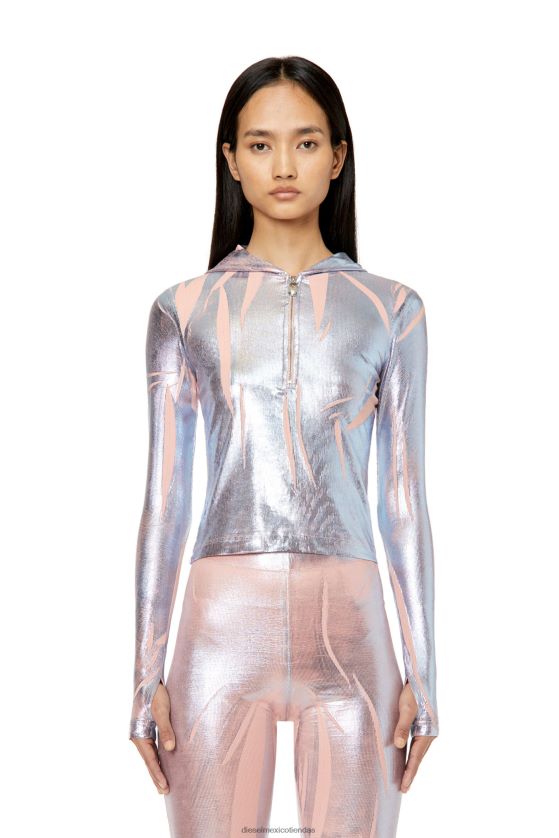 parte de la colección de pasarela primavera verano 2023, esta camiseta con capucha acanalada está hilada con hilo de lurex con un estampado metalizado para un efecto metálico de dos tonos. la prenda se dobla aleatoriamente durante el proceso de impresión para dejar parches lisos. completo con un cierre de media cremallera y orificios para los pulgares.