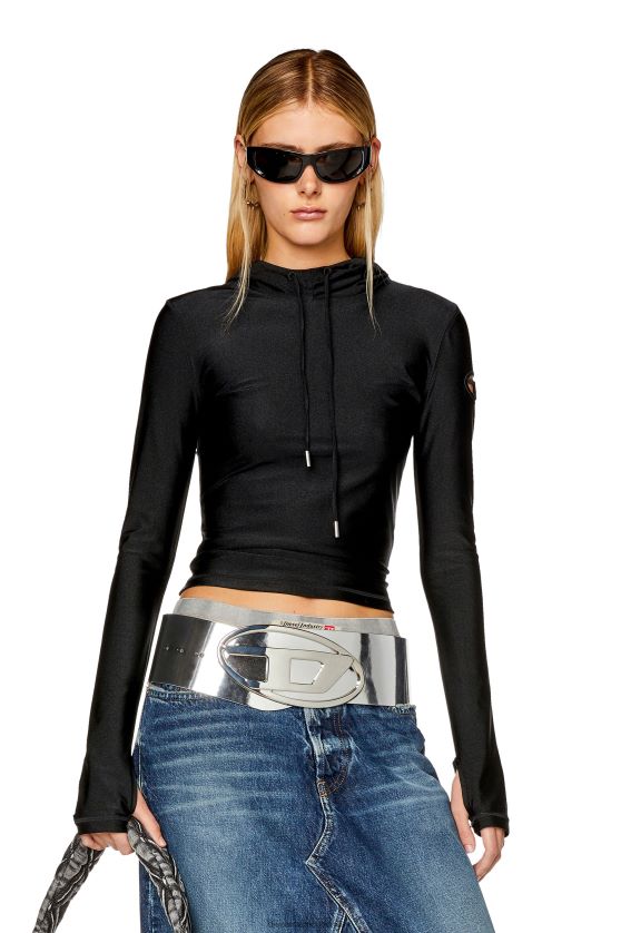 Esta sudadera con capucha para mujer está diseñada para un ajuste ceñido con tejido jersey de nailon elástico ultrabrillante. un corte con una d ovalada bordada en la manga crea un efecto peek-a-boo.