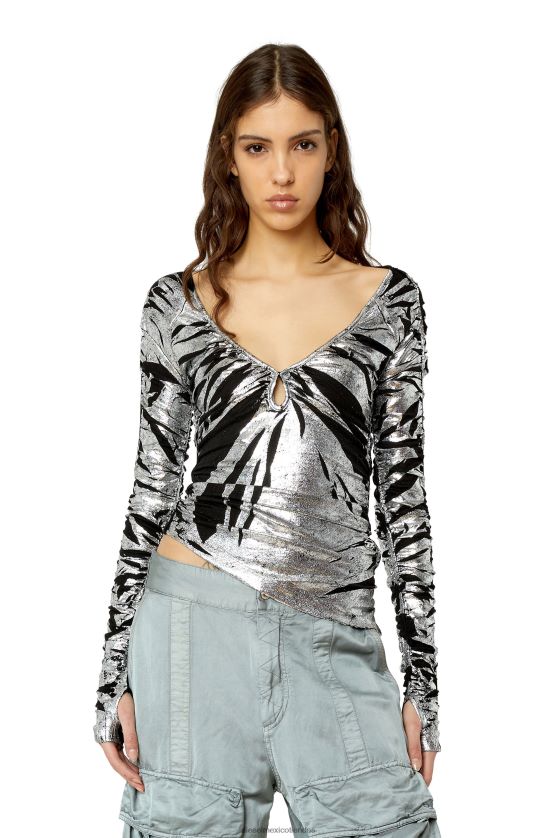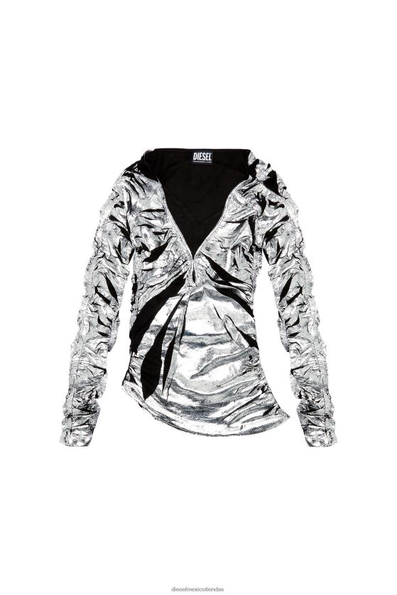 este top fruncido de manga larga está confeccionado en viscosa elástica para un ajuste ceñido y cubierto con una lámina metalizada para un efecto brillante. diseñado con un escote en V en forma de lágrima y orificios para los pulgares, este estilo de mujer hace alarde de un dobladillo asimétrico con placa de metal ovalada 'd'.