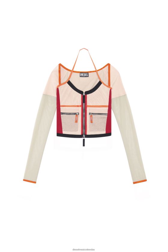 Top cropped slim fit cápsula del desfile de moda, confeccionado en malla de doble capa con paneles acanalados y pespuntes. Bloque de color con cinta lateral de punto y ribete, se actualiza con un cuello halter. parche d en la espalda y tiradores de cremallera con logo.