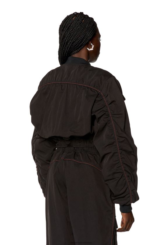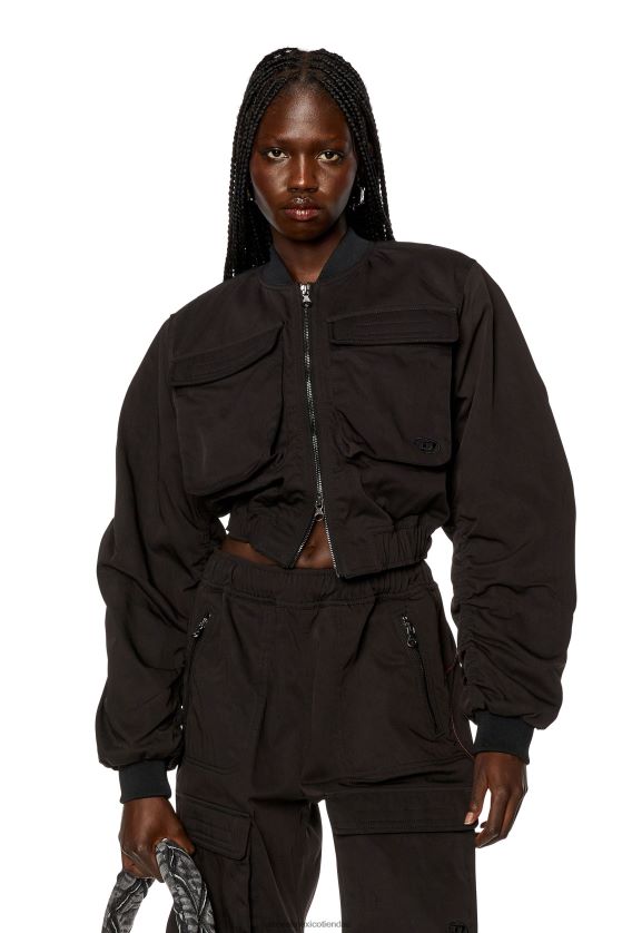 esta chaqueta para mujer presenta una silueta bomber ligeramente recortada, confeccionada con nailon taslán con un tacto suave similar al algodón. está ligeramente acolchado para brindar calidez y tiene detalles con grandes bolsillos utilitarios, uno de los cuales lleva un logotipo "oval d" bordado. las mangas tienen costuras fruncidas sutiles para agregar volumen.