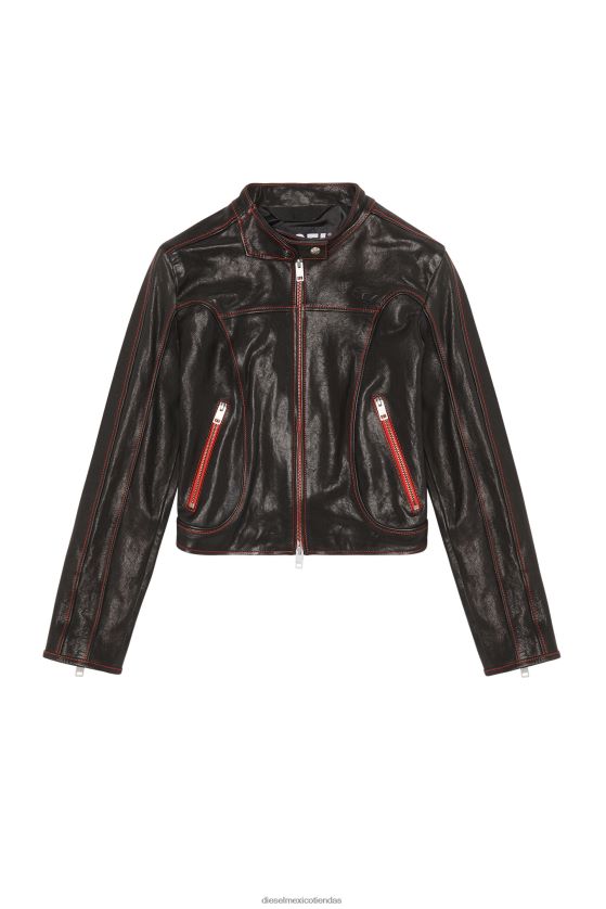 Chaqueta motera para mujer inspirada en los estilos moteros vintage. Confeccionado con cuero negro flexible para un ajuste regular, este estilo está decorado con un emblema "oval d" en relieve y forrado para mayor comodidad. las cremalleras rojas y las costuras resaltan la silueta.