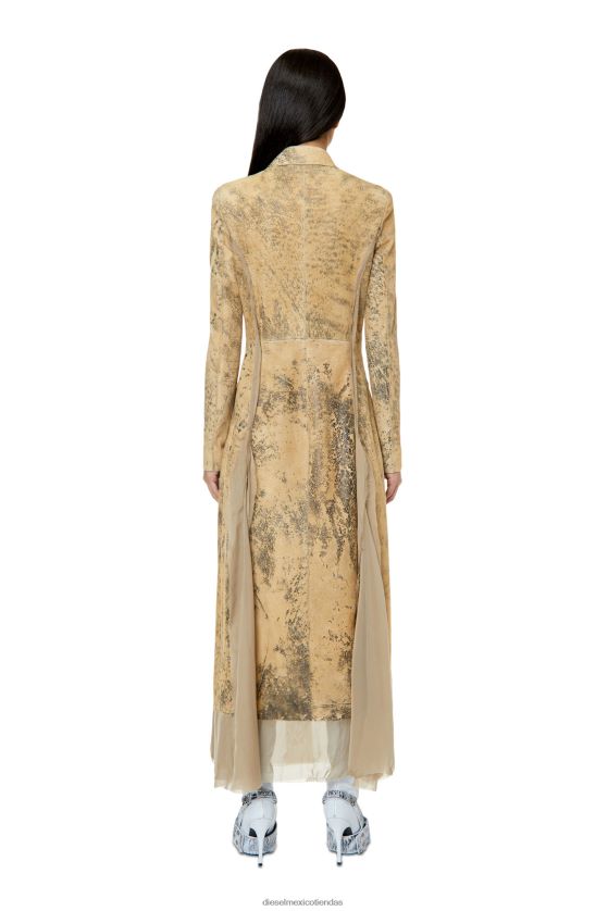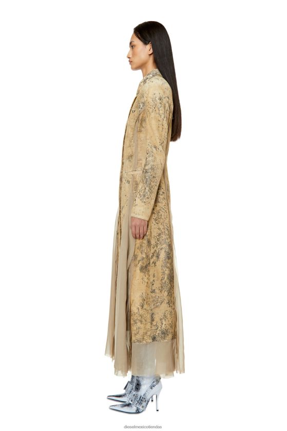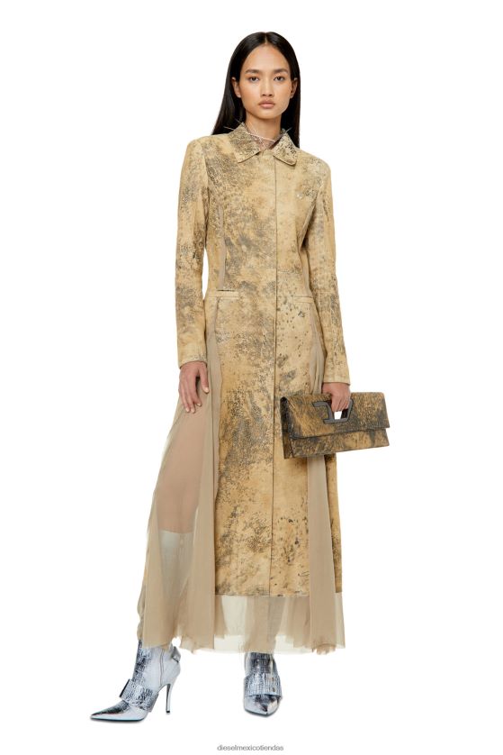 Chaqueta regular fit del desfile primavera verano 2023. Confeccionada con cuero sin teñir, esta prenda está cubierta con un pigmento negro que luego se elimina manualmente para lograr un aspecto desgastado. su silueta de palangre se realza con inserciones de gasa y adornos de cuero sin rematar producidos a partir de los recortes. placa de metal d en el pecho.