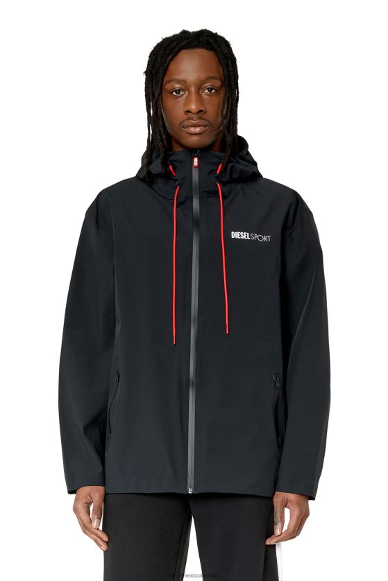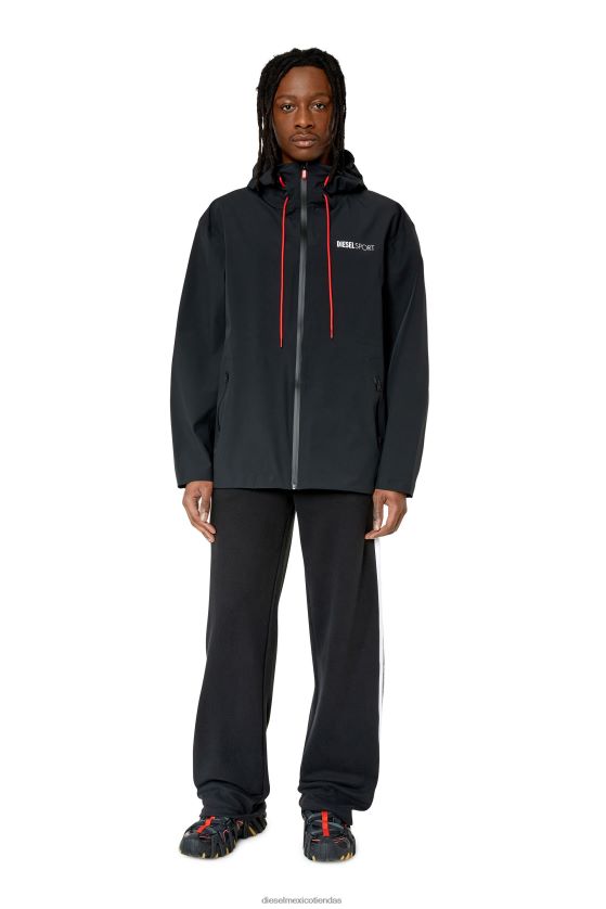 esta chaqueta deportiva diesel para hombre está confeccionada con un tejido negro resistente al agua. una solapa trasera proporciona ventilación, mientras que un cordón elástico en el dobladillo y las costuras selladas evitan que entre el aire frío. las letras del logotipo en el pecho completan el diseño.
