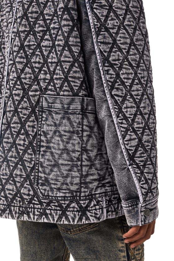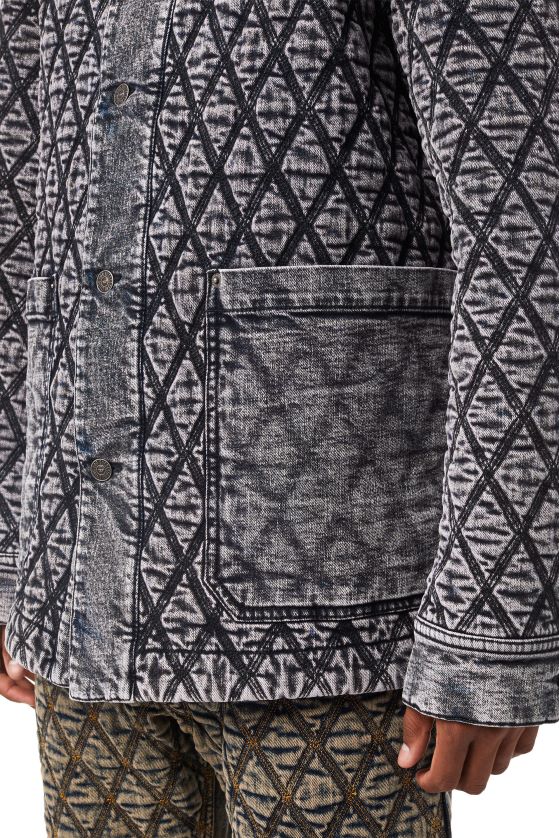 esta chaqueta de corte cuadrado con silueta de ropa de trabajo forma parte de la colección de desfiles de moda ss22. cuenta con bolsillos de parche en la parte delantera y trasera.