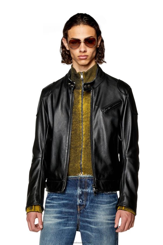 esta chaqueta motera para hombre confeccionada en suave piel abatanada. la silueta delgada presenta paneles cosidos con aguja en el escote y en la espalda para mayor flexibilidad. los detalles de parches en los hombros y los codos realzan el estilo inspirado en las motos. las pequeñas abrasiones le dan un aspecto y una sensación de uso.