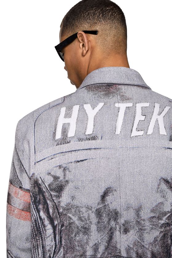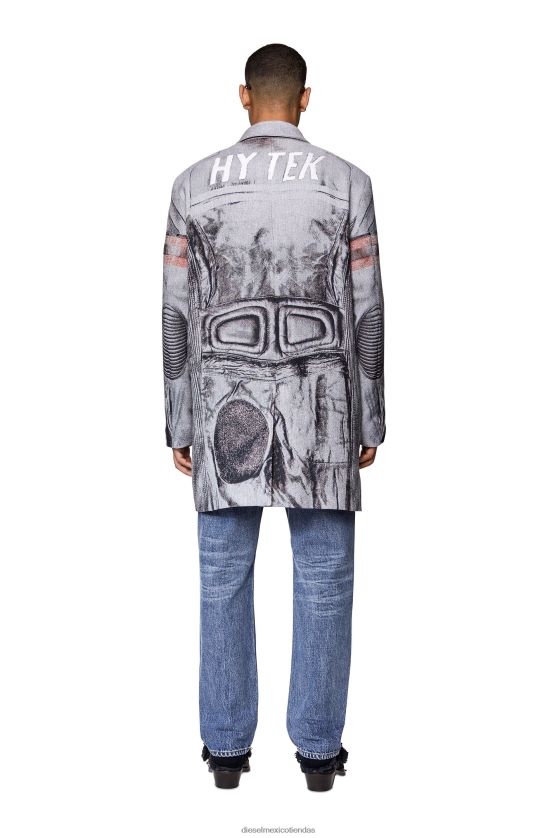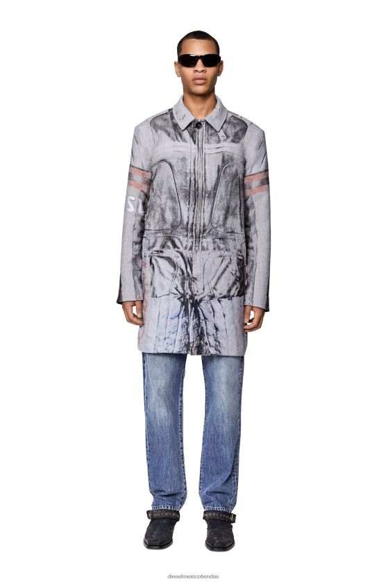 Abrigo colección desfile ss22 en jacquard de lana virgen y mezcla de seda. las cremalleras trompe l'oeil, el acolchado y los parches en los codos son parte de un intrincado patrón tejido que recrea el estilo de una chaqueta de motociclista clásica. el estilo está completamente forrado y presenta un ajuste regular.