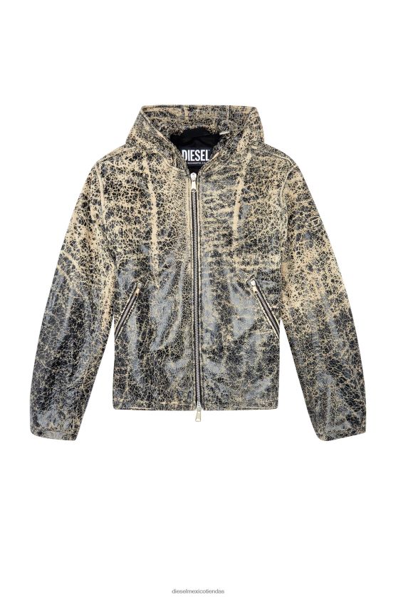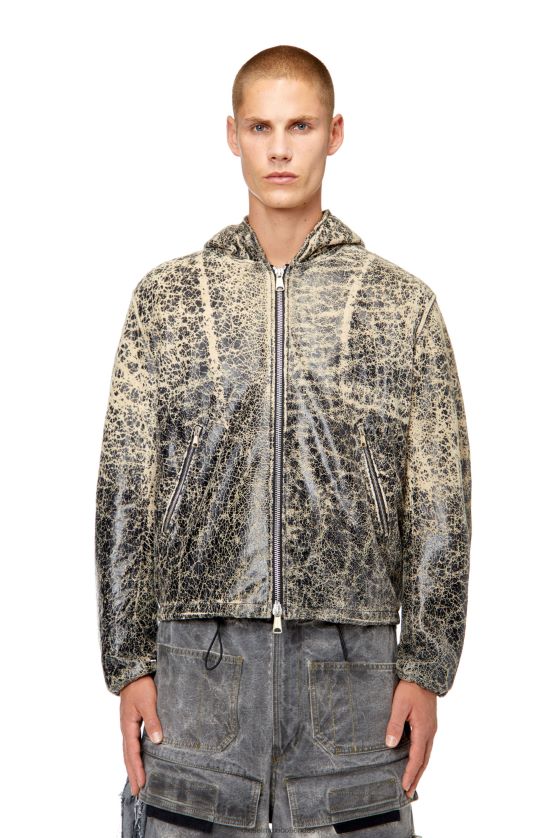 esta chaqueta de hombre de corte regular para desfile primavera verano 2023 con cordón en la capucha está confeccionada con cuero natural sin teñir, recubierto con una lámina negra que se quitó manualmente en la parte superior solo para lograr un efecto degradado distintivo. un tratamiento agrietado imparte un aspecto desgastado.