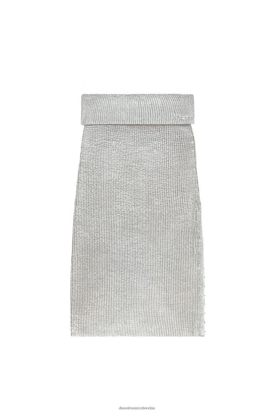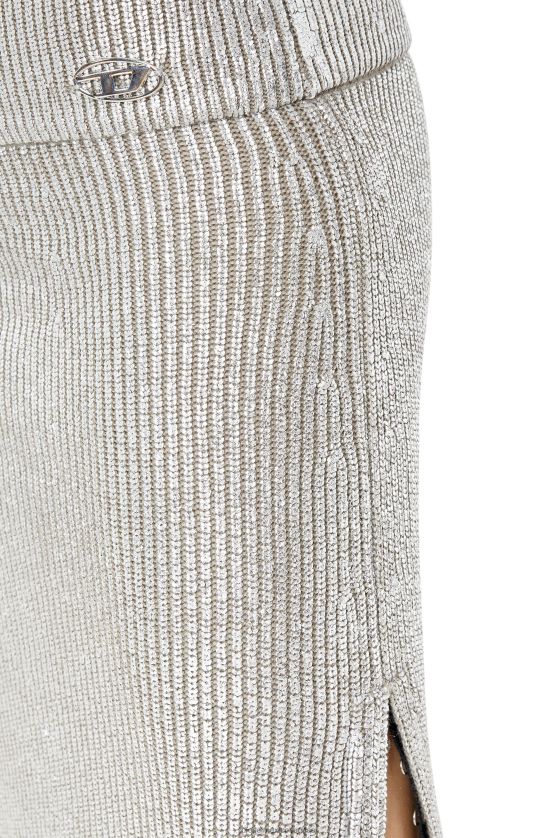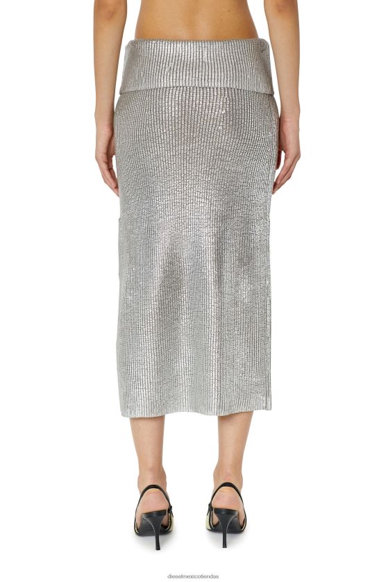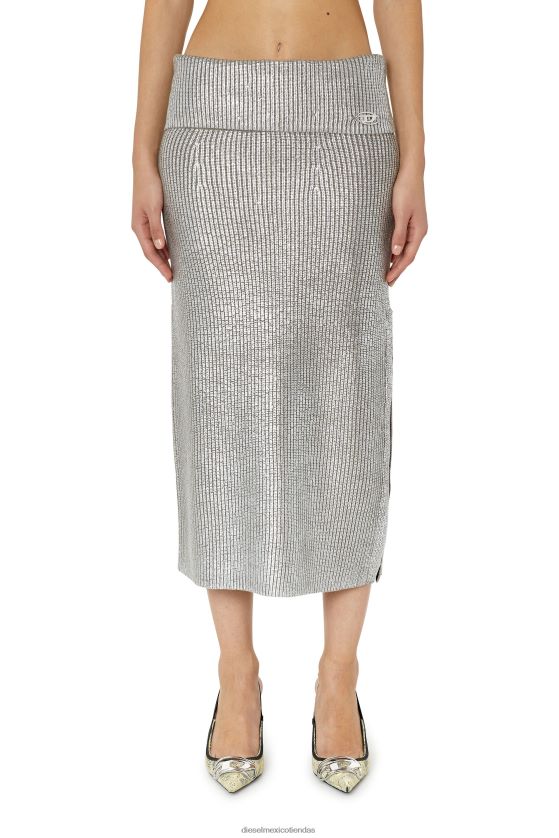 falda midi gruesa de punto maíz tejida en lana. su ajuste delgado se realza con una pretina de alto volumen y una abertura izquierda con cinta de gancho y ojo. un estampado de lámina en contraste crea un efecto de dos tonos, rematado con una placa 'd' ovalada de metal a juego.