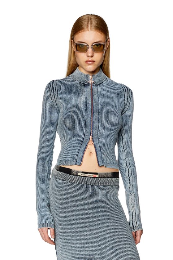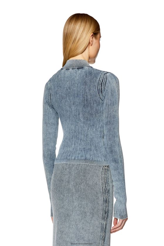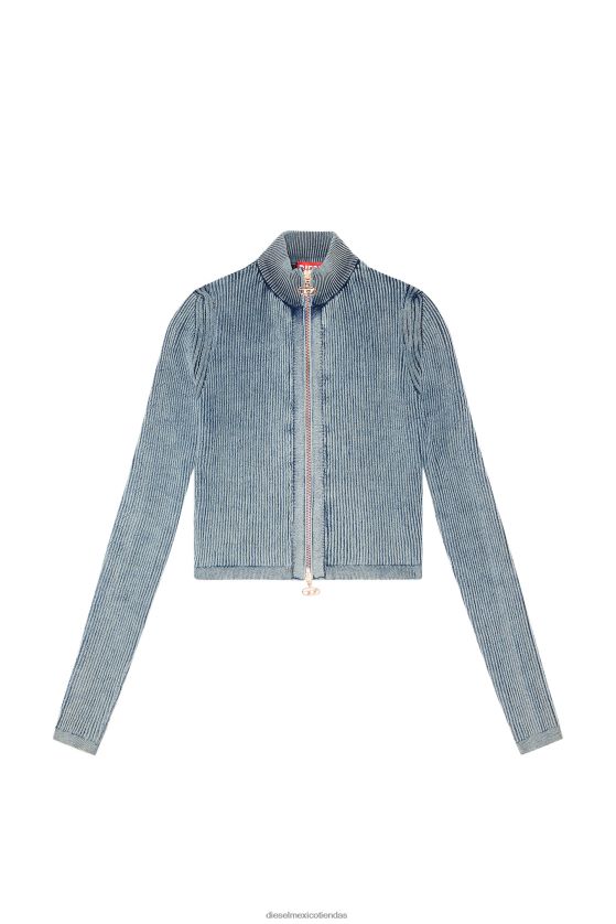 Top de mujer de manga larga, en punto canalé de hilo índigo con lycra en el reverso para un especial efecto ondulado. un tratamiento de lavado a la piedra imparte un sutil aspecto vintage. la silueta ajustada se detalla con un tirador de cremallera en forma de d ovalada.