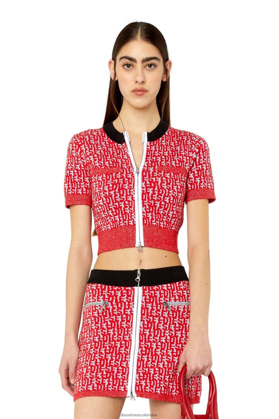 Tejido de viscosa, este cárdigan con cremallera para mujer tiene un corte ajustado y recortado y mangas cortas. el monograma diesel por toda la prenda está tejido en jacquard con hilo bouclé de mezcla de algodón, lo que le da al patrón una textura más pronunciada. detalles en contraste completan el look.