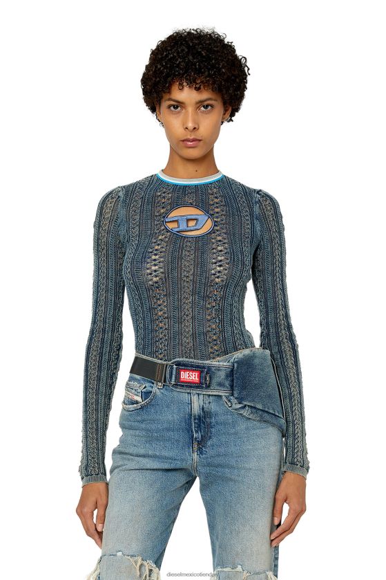 este jersey ajustado de mujer está tejido en algodón azul oscuro con un punto pointelle para un delicado efecto de encaje. actualizado con una abertura en el pecho con el logotipo de la D ovalada bordado y una cinta deportiva en el cuello. teñido en prenda para un look desgastado.