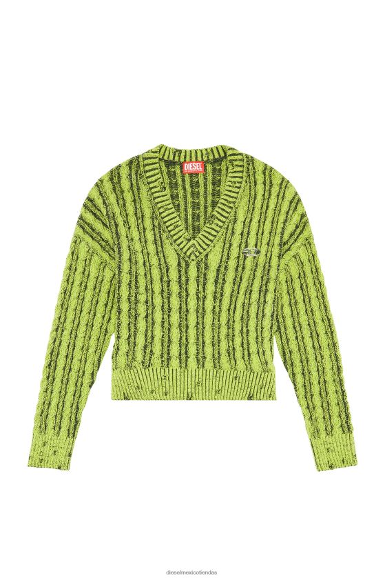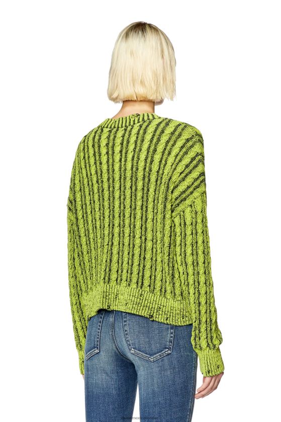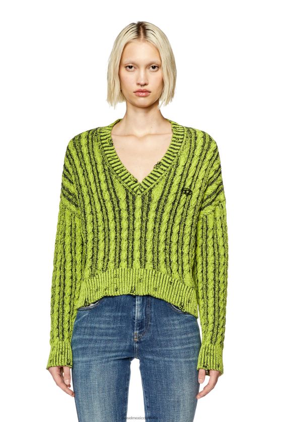 Tejido de algodón con un tacto suave similar a la chenilla, este jersey con cuello de pico para mujer combina canalé y ochos en un diseño de dos tonos. su perfil holgado está diseñado con un dobladillo delantero elevado, hombros caídos y ribetes acanalados desgastados.