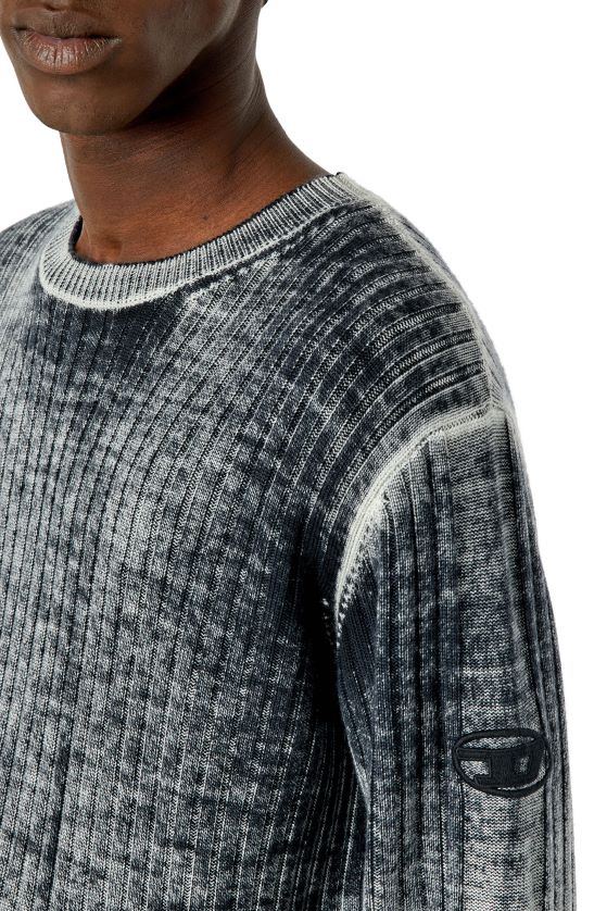 hilado de lana, este suéter para hombre está tejido acanalado para un ajuste ceñido y estampado en el reverso: el color se filtra de adentro hacia afuera, creando variaciones de tonos únicas. un logotipo bordado decora la manga.