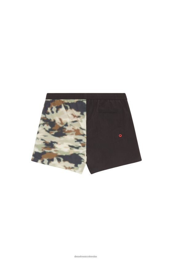 bañador de hombre de longitud media confeccionado en nailon de secado rápido con un aspecto lavado arrugado. su diseño de camuflaje está marcado con un estampado diesel en la pierna izquierda y un parche con el logo en la cintura. ribetes y aberturas redondeadas en el dobladillo definen la silueta.