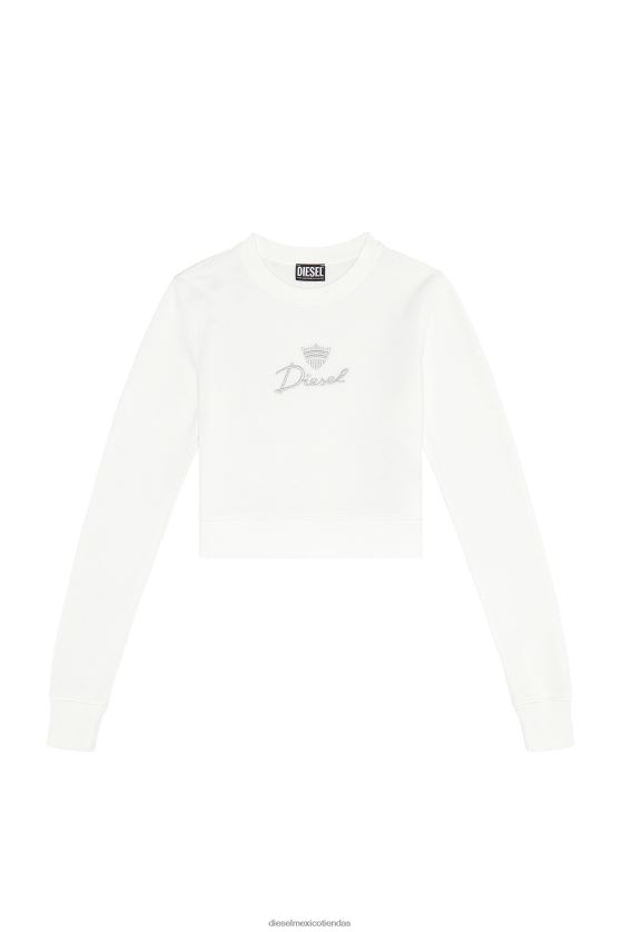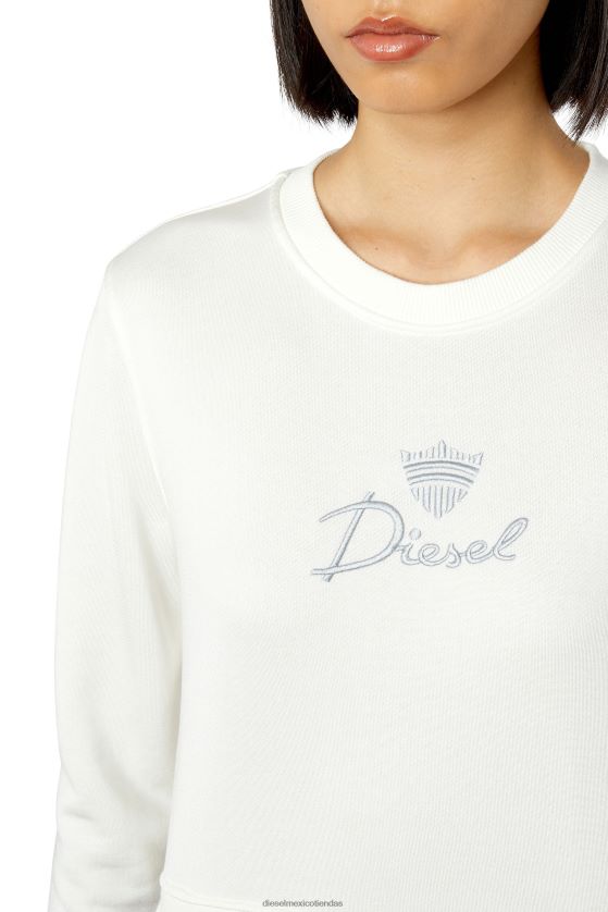 Esta sudadera de corte ajustado para mujer está confeccionada con una mezcla de punto de algodón y viscosa y está rematada con ribetes acanalados. teñido en prenda para una apariencia desteñida, está bordado con el logo del emblema diesel en el frente.