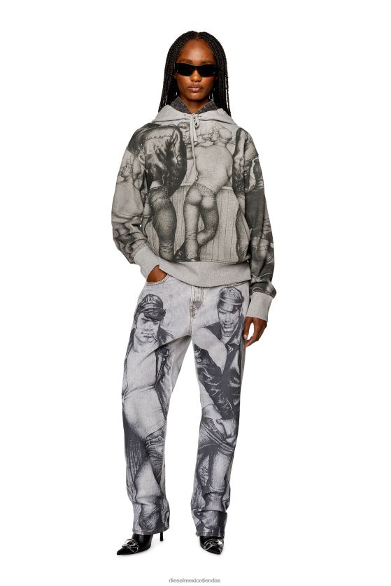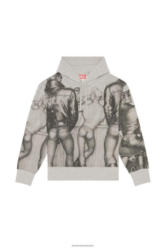 sudadera gris jaspeada de manga larga, cortada a un ajuste extragrande y detallada con gráficos de barras de tom de la colección de obras de la fundación tom of finland (toff). Terminado con puños y dobladillo acanalados, y un lazo de lona en la parte posterior de la capucha con una cita del artista.
