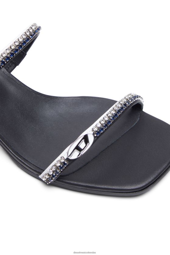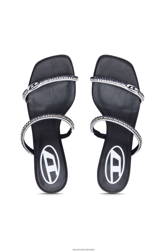 Sandalias de mujer de piel negra con puntera cuadrada, esculpidas con tiras bicolor cubiertas de cristales de swarovski. rematado con tacón mini y placa d de metal.