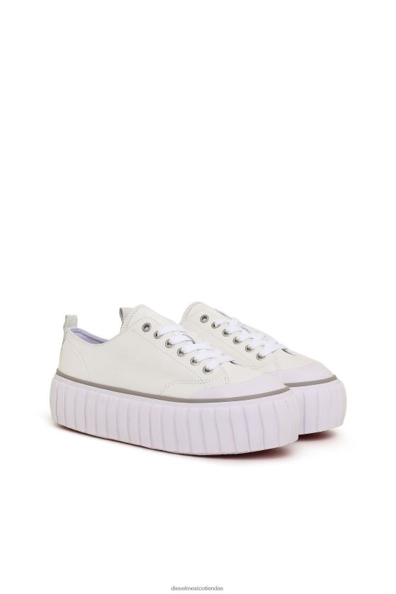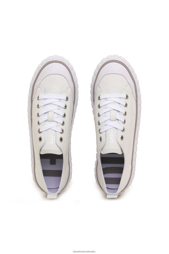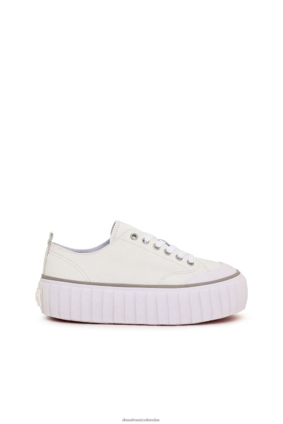 estas zapatillas deportivas bajas están confeccionadas en piel suave y llevan la marca con letras diésel en el mismo tono en la lengüeta. Sostenida por una suela de plataforma de goma vulcanizada con una textura estriada gruesa y un logotipo D en la parte posterior, la parte superior está reforzada con una puntera de goma.